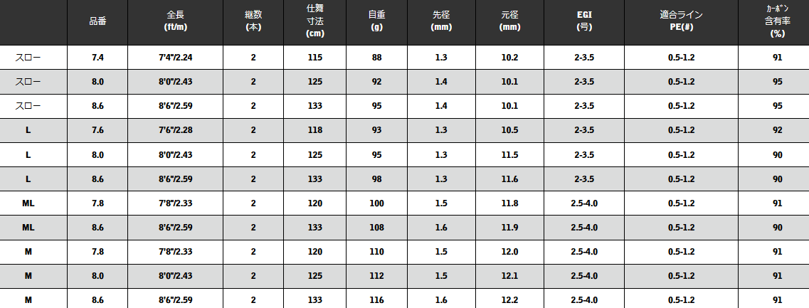 スロー/Lは3.5寸以下のエギで様々なシチュエーションに対応し、ML/MはMAX4寸まで対応となっております。