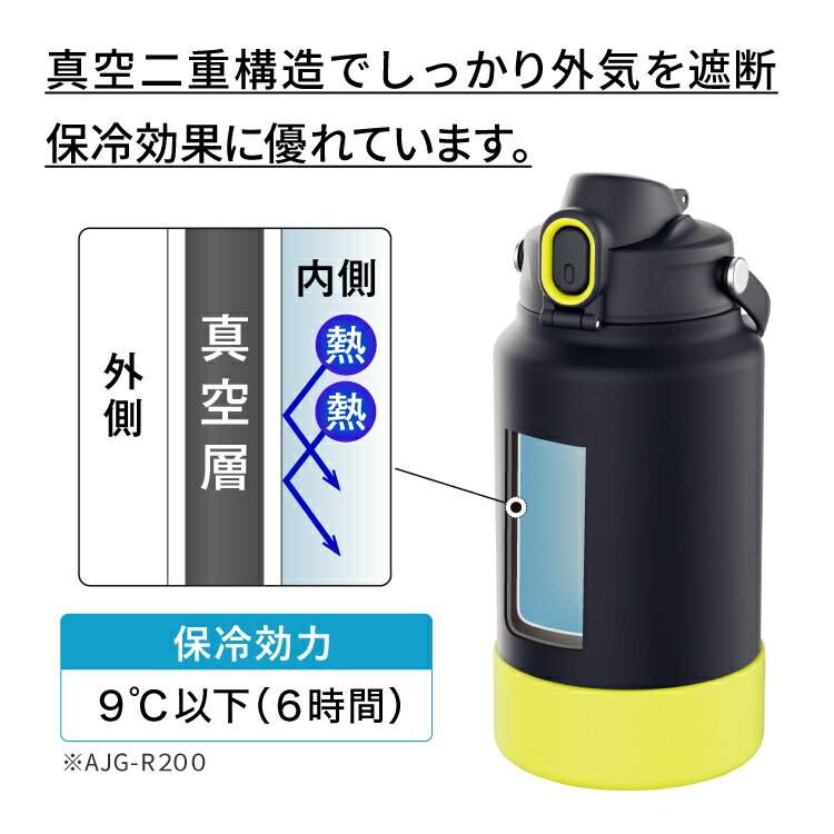 ●【商品サイズ】幅12.2×奥行13.5×高さ28.4cm、口径/約6.9cm、本体重量:約0.75kg、容量:2000ml●【素材・材質】 胴部/ステンレス(アクリル樹脂塗装)、せん・ふた/ポリプロピレン、パッキン・底カバー/シリコーンゴム●【保冷効力】:8℃以下(6時間) *本製品は保冷専用です●【生産国】 中国 関連キーワード/水筒 ボトル 魔法瓶 保冷 ステンレス 直飲み 直のみ ストレートドリンク ダイレクト ワンタッチ ジャグ スポーツ スポーツボトル スポーツジャグ スポーツドリンクOK スポーツ飲料対応 洗いやすい 運動 レジャー アウトドア 部活 クラブ サッカー 野球 通学 メンズ レディース 男性 女性 男の子 女の子 子供 子ども こども キッズ 小学生 中学生 高校生 学生 大人 ブラック 黒 黒色 2リットル 2000ml 2L AJG-R200 7