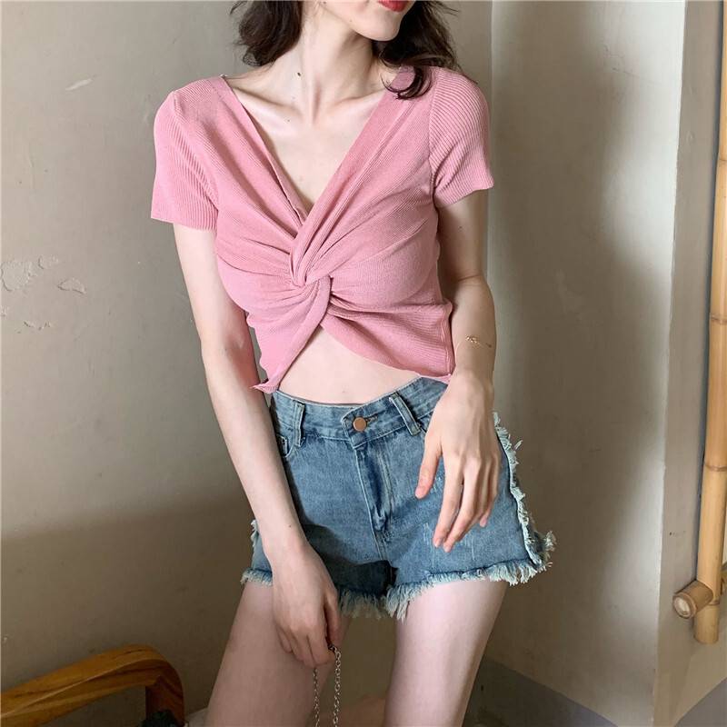トップス ねじりTシャツ ねじり ピッタリTシャツ スタイル Vネック 深いVネック おしゃれ タイト デイリー 無地 セクシー 半袖 半袖Tシャツ ホワイト ブラック サーモンピンク アプリコット ブルー ワインレッド イエロー カーキ8色