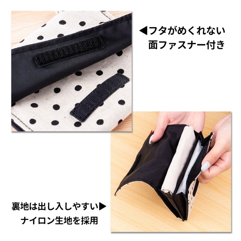 面ファスナーでフタ浮きを防止 裏地はナイロンなので滑りやすく、出し入れスムーズ マチが広がるユニークな構造 お洋服選びの悩み解決!ポケットなくても大丈夫♪