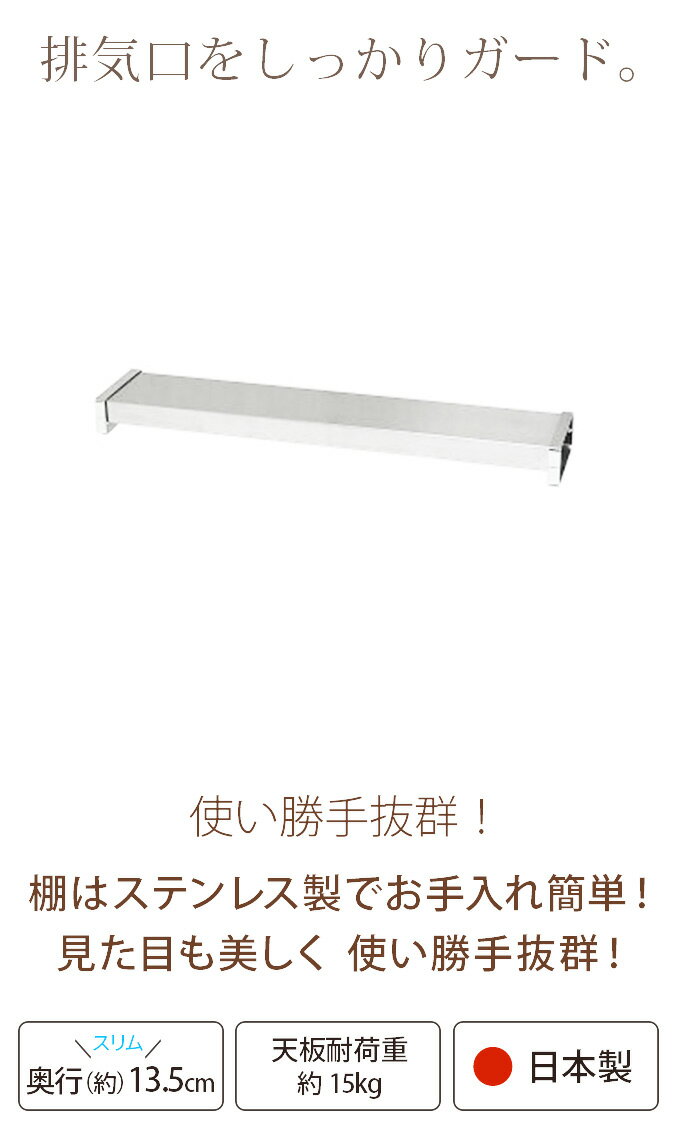 商品番号:adch0258排気口カバー コンロ幅60用 商品詳細 品名排気口カバー コンロ幅60用サイズ【本体】約幅65×奥行13.5×高さ6cm【内寸】約幅61.5×奥行12cm重量0.8kg梱包重量:約1.2kg材質【フレーム】スチール/クロムメッキ【棚】ステンレス生産国日本備考お客様組立品耐荷重【天板】約15kgキャッチコピー排気口をしっかりガード。