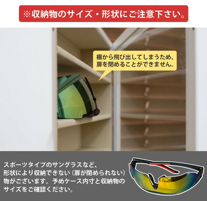 スポーツタイプのサングラス等、メガネの形状によっては扉が閉められない為収納できない物がございます。