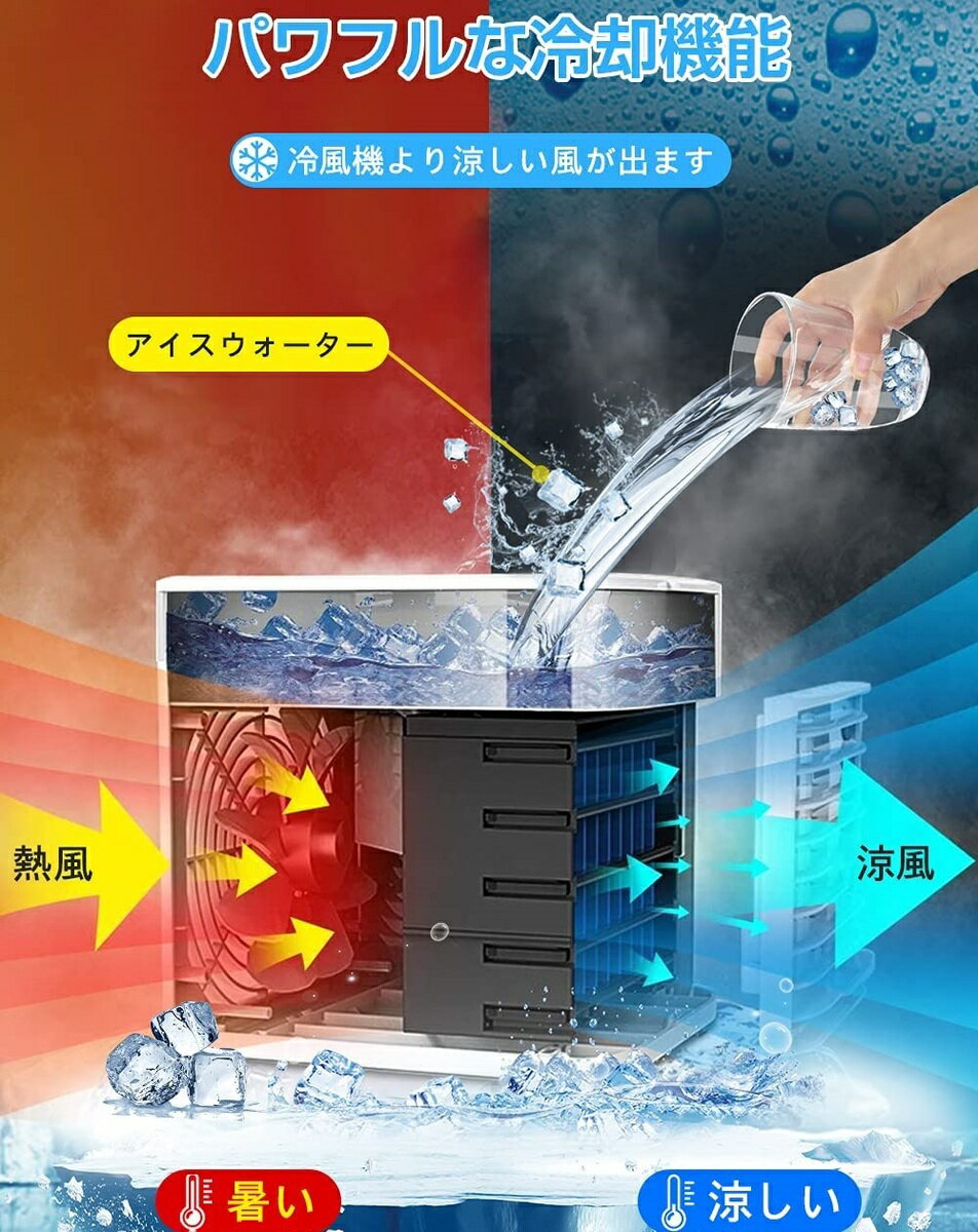 卓上冷風扇 冷風扇 卓上冷風機 ポータブル冷風扇 小型 コンパクト冷風扇 軽量 ミニ扇風機 スポットクーラー 水漏防止 空気浄化 銀イオン除菌フィルター 7色led常夜灯 U-V ledライト 3段階風量調節 風向き上下調整 省エネ usb給電 日本語説明書 熱中症対策 暑さ対策